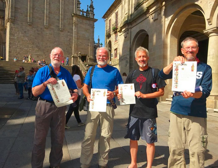 I am in the Cathedral in Santiago de Compostela, Spain, have completed our 500-mile walk to Santiago yesterday……Yesterday, Carl, Larry, Bill and I walked into Santiago from O’Pedreizo together, one of the only days on this entire Camino that we have all walked together. It was good to walk with each other and to finish this journey together – this is as it should be.