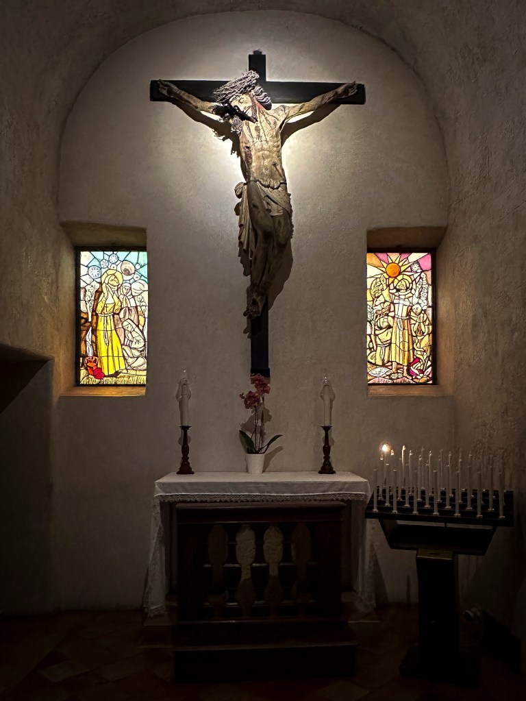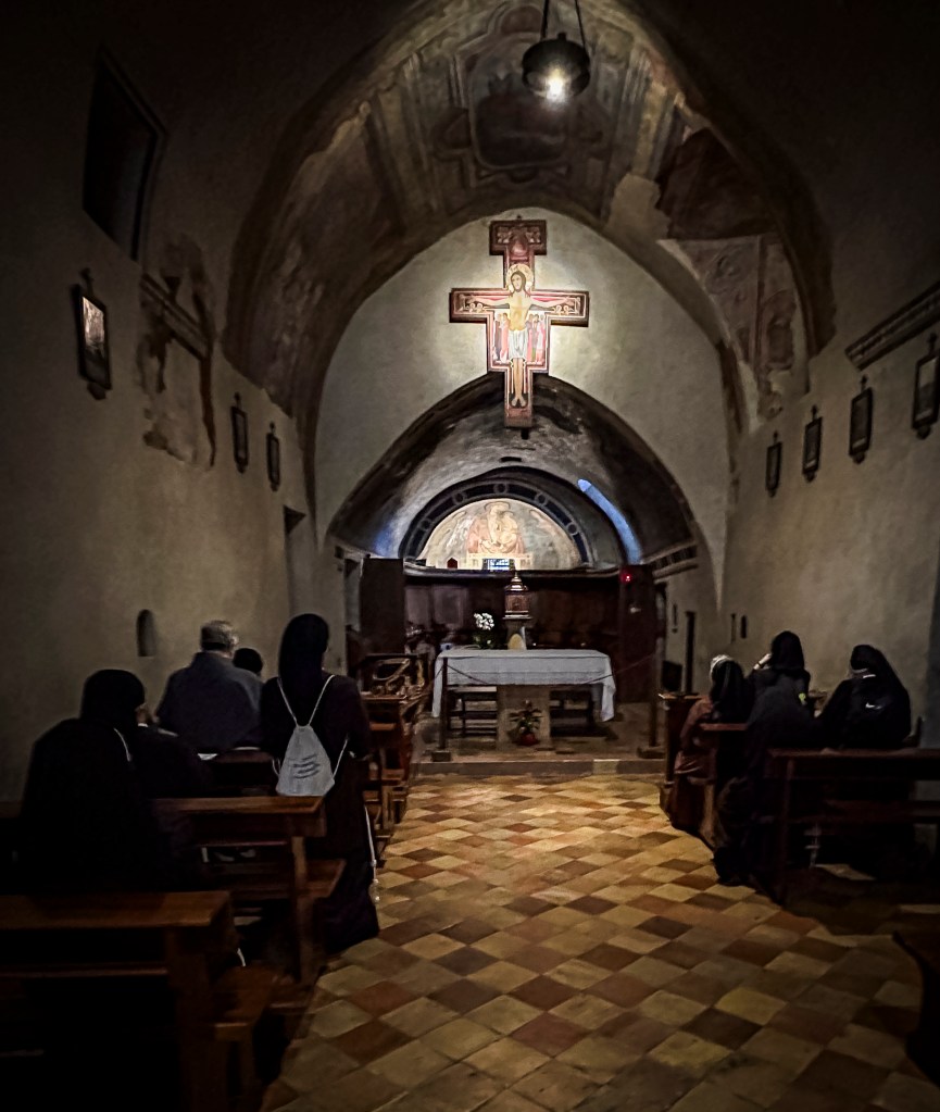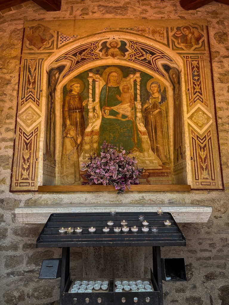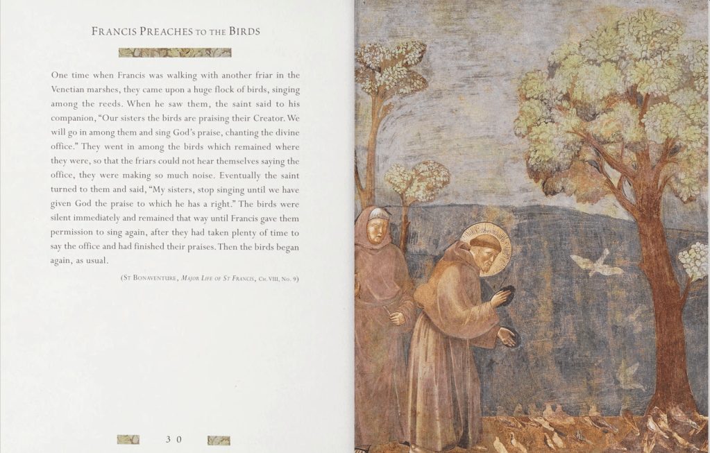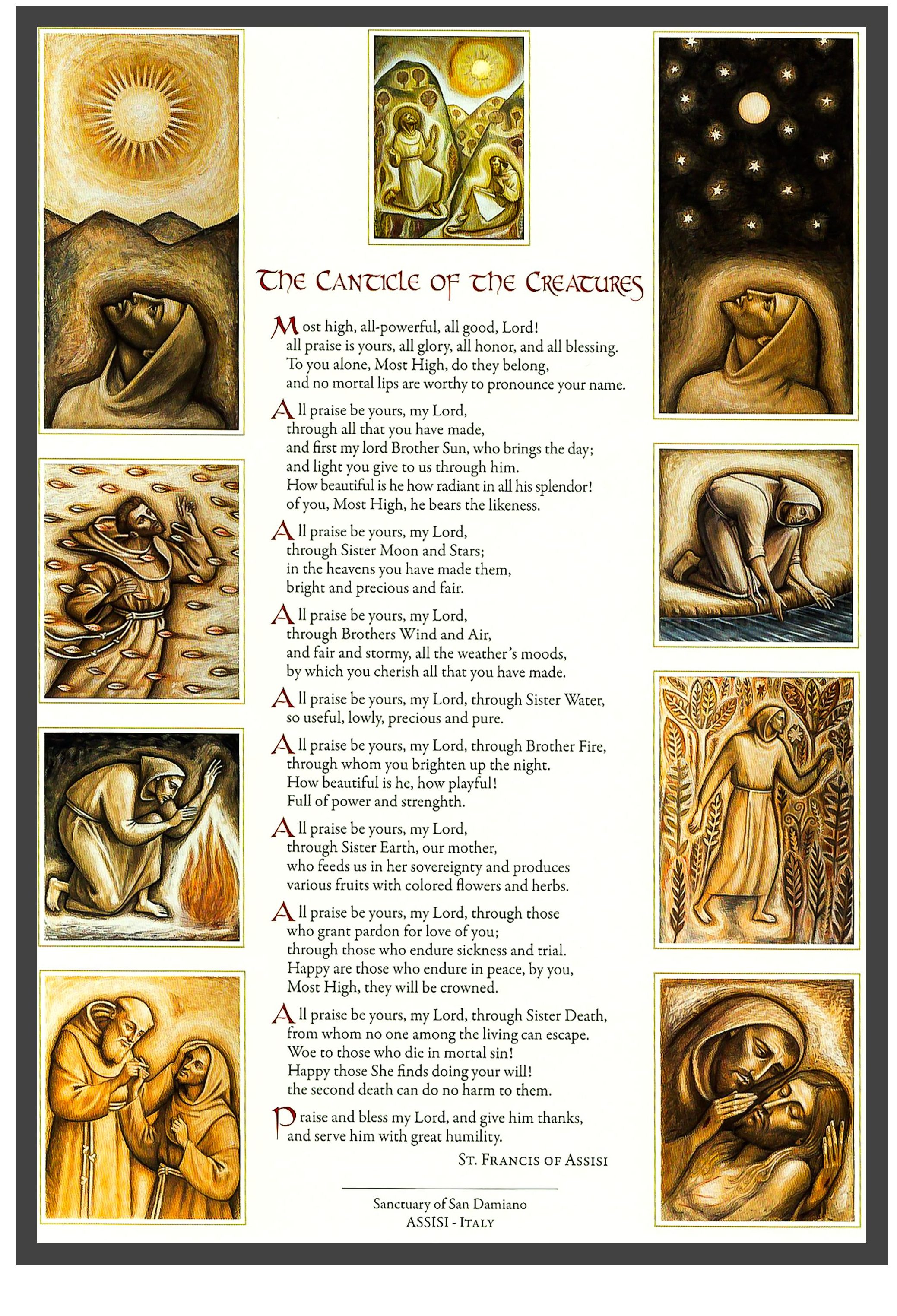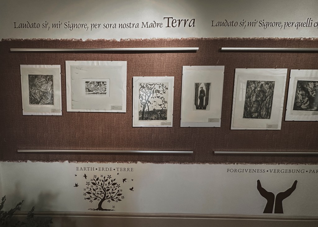 IN 2024 I was blessed to visit St. Francis’ hometown of Assisi, Italy. The Basilica that was built there is beautiful and inspiring, and a wonderful pilgrimage destination. Likewise, San Damiano, which is just a short distance down the hill from Assisi, is where St. Francis received his vision to repair God’s church. At San Damiano, the Friars Minor of San Damiano have a Gallery of the Canticle, which includes artworks “to transmit the enthusiasm of St. Francis for ‘The Most High, Omnipotent and Good Lord’ through the language of art, in particular drawings, picture and sculpture.” Below is an image of the Canticle of the Creatures, with corresponding art by Piero Casentini.